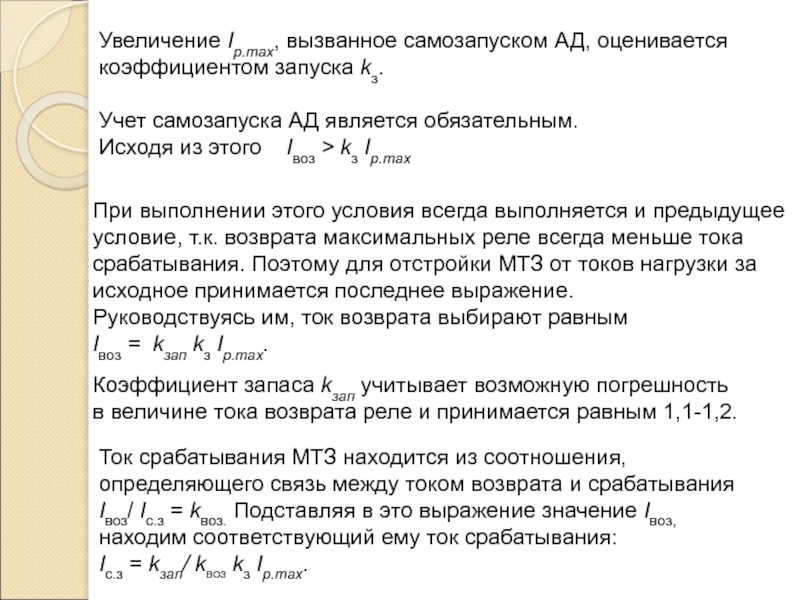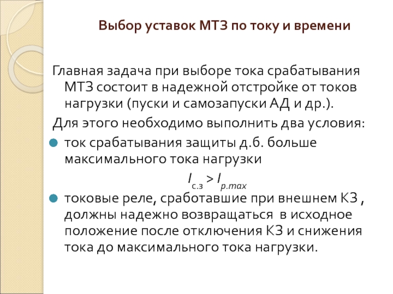 срабатывания. Поэтому для отстройки МТЗ от токов нагрузки за