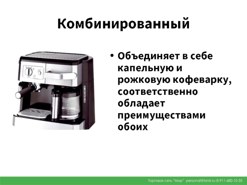 Объединяет в себе капельную и рожковую кофеварку, соответственно обладает преимуществами обоих