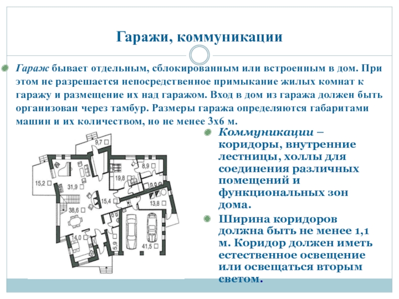 не разрешается непосредственное примыкание жилых комнат к гаражу и размещение их над гаражом. Вход в дом из гаража должен быть организован через тамбур. Размеры гаража определяются габаритами машин и их количеством, но не менее 3х6 м.