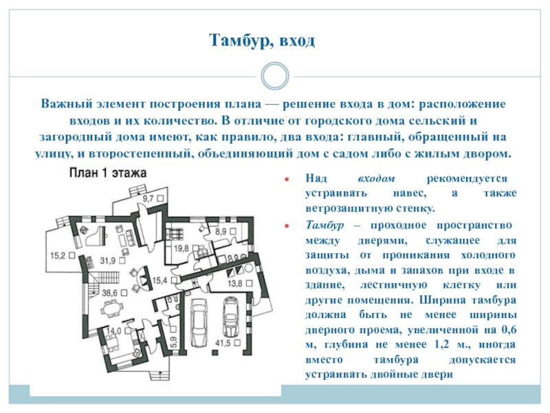 Слайд 11Важный элемент построения плана — решение входа в дом: расположение входов