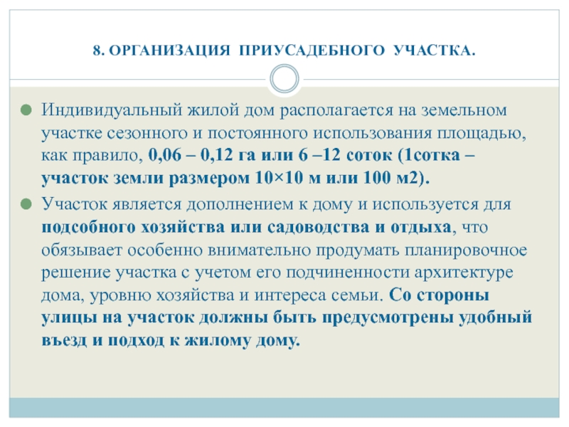 Участок является дополнением к дому и используется для подсобного хозяйства или садоводства и отдыха, что обязывает особенно внимательно продумать планировочное решение участка с учетом его подчиненности архитектуре дома, уровню хозяйства и интереса семьи. Со стороны улицы на участок должны быть предусмотрены удобный въезд и подход к жилому дому.