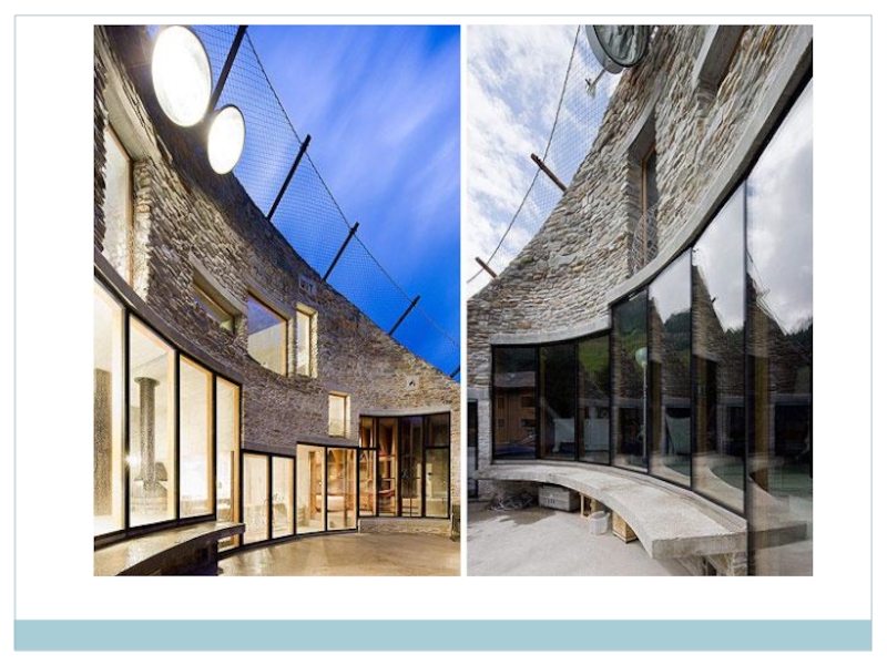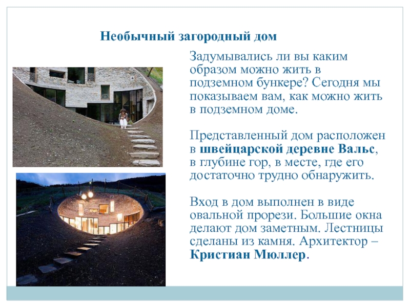 Вход в дом выполнен в виде овальной прорези. Большие окна делают дом заметным. Лестницы сделаны из камня. Архитектор – Кристиан Мюллер.