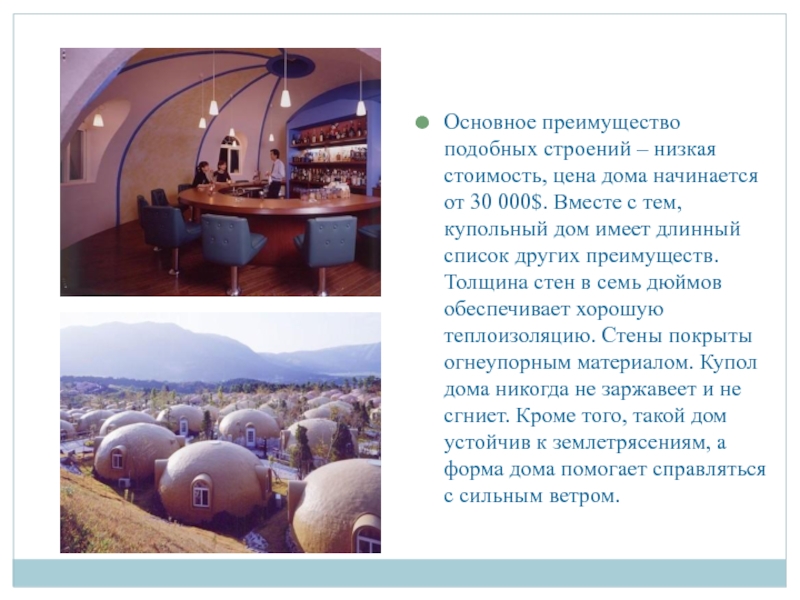 30 000$. Вместе с тем, купольный дом имеет длинный список других преимуществ. Толщина стен в семь дюймов обеспечивает хорошую теплоизоляцию. Стены покрыты огнеупорным материалом. Купол дома никогда не заржавеет и не сгниет. Кроме того, такой дом устойчив к землетрясениям, а форма дома помогает справляться с сильным ветром.