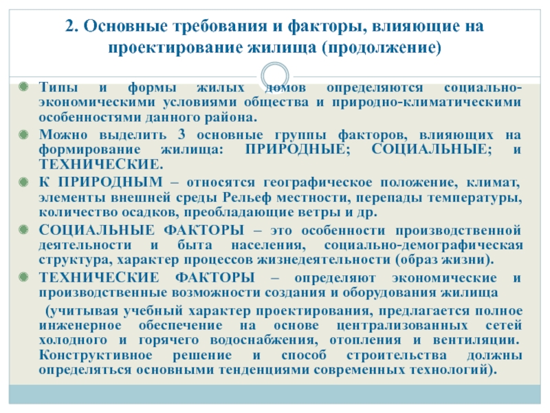 Слайд 52. Основные требования и факторы, влияющие на проектирование жилища (продолжение)