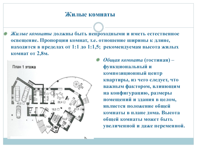 Слайд 13Жилые комнаты должны быть непроходными и иметь естественное освещение. Пропорции комнат,