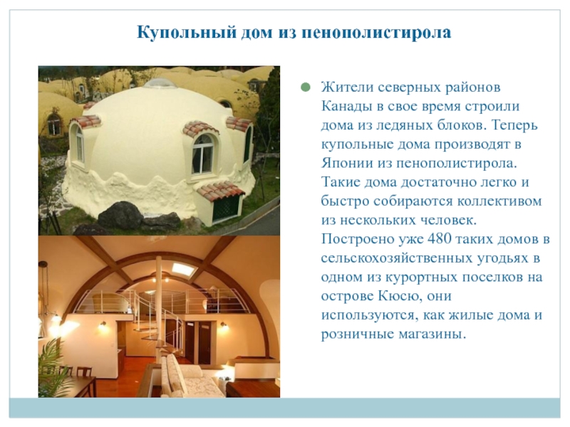 из ледяных блоков. Теперь купольные дома производят в Японии из пенополистирола. Такие дома достаточно легко и быстро собираются коллективом из нескольких человек. Построено уже 480 таких домов в сельскохозяйственных угодьях в одном из курортных поселков на острове Кюсю, они используются, как жилые дома и розничные магазины.