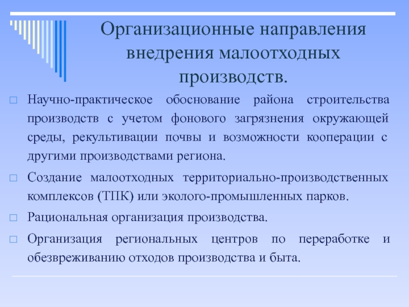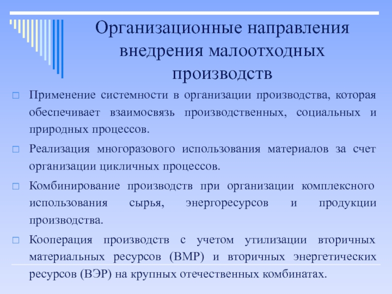 Слайд 10Организационные направления внедрения малоотходных производств.