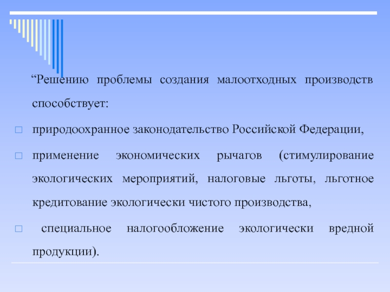 экономических рычагов (стимулирование экологических мероприятий, налоговые льготы, льготное кредитование экологически чистого производства,