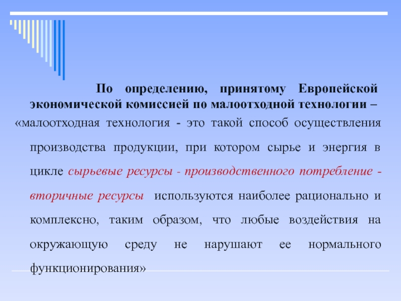 «малоотходная технология - это такой способ осуществления производства продукции, при котором сырье и энергия в цикле сырьевые ресурсы - производственного потребление -вторичные ресурсы используются наиболее рационально и комплексно, таким образом, что любые воздействия на окружающую среду не нарушают ее нормального функционирования»