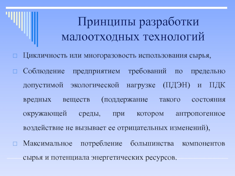 требований по предельно допустимой экологической нагрузке (ПДЭН) и ПДК вредных веществ (поддержание такого состояния окружающей среды, при котором антропогенное воздействие не вызывает ее отрицательных изменений),
