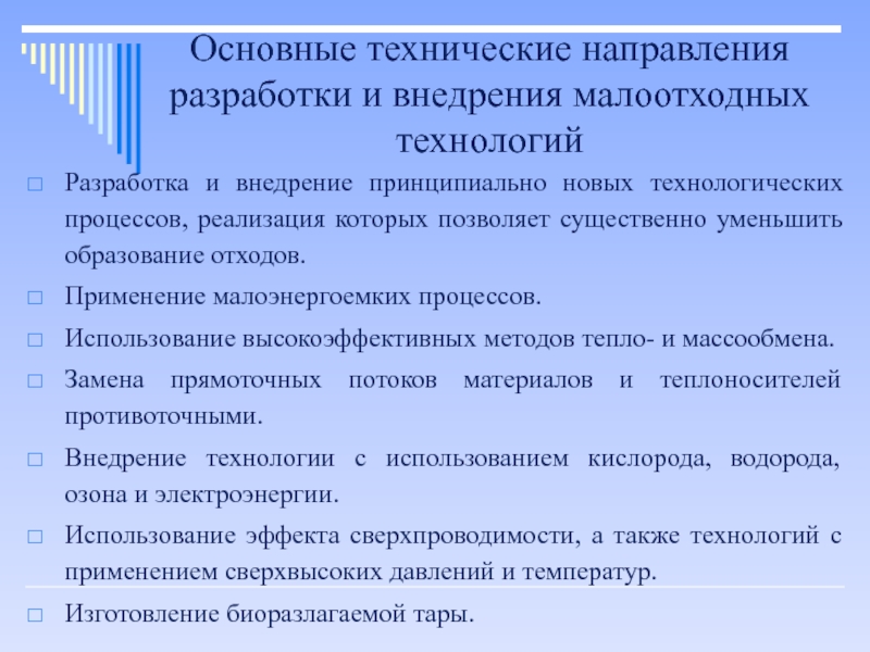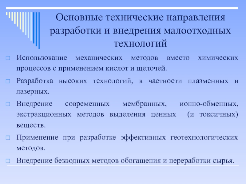 Слайд 8Основные технические направления разработки и внедрения малоотходных технологий