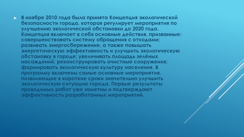 В ноябре 2010 года была принята Концепция экологической безопасности города, которая