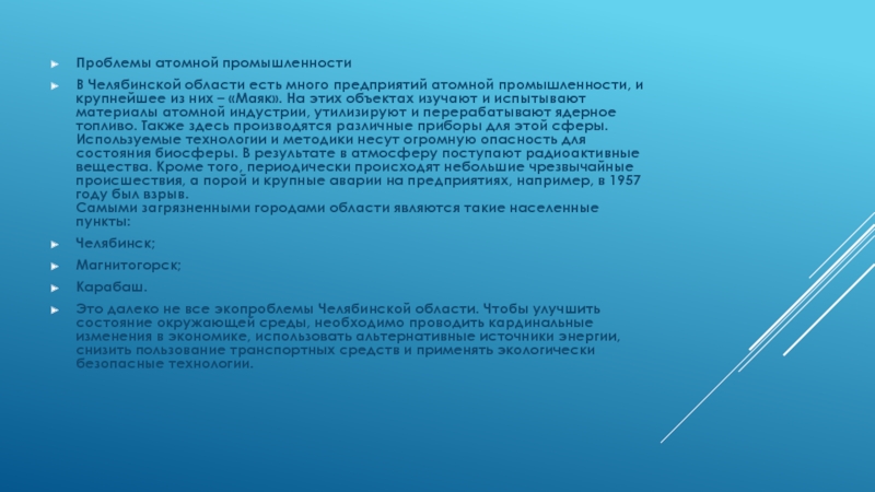 крупнейшее из них – «Маяк». На этих объектах изучают и испытывают материалы атомной индустрии, утилизируют и перерабатывают ядерное топливо. Также здесь производятся различные приборы для этой сферы. Используемые технологии и методики несут огромную опасность для состояния биосферы. В результате в атмосферу поступают радиоактивные вещества. Кроме того, периодически происходят небольшие чрезвычайные происшествия, а порой и крупные аварии на предприятиях, например, в 1957 году был взрыв.