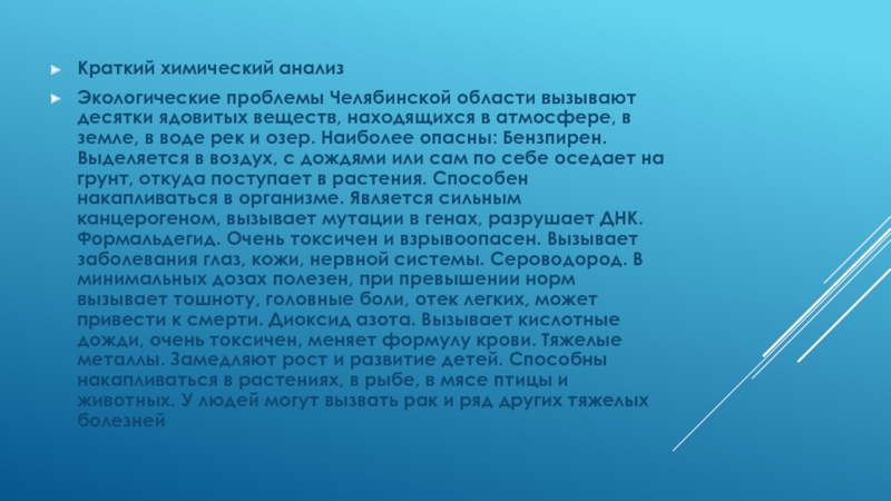находящихся в атмосфере, в земле, в воде рек и озер. Наиболее опасны: Бензпирен. Выделяется в воздух, с дождями или сам по себе оседает на грунт, откуда поступает в растения. Способен накапливаться в организме. Является сильным канцерогеном, вызывает мутации в генах, разрушает ДНК. Формальдегид. Очень токсичен и взрывоопасен. Вызывает заболевания глаз, кожи, нервной системы. Сероводород. В минимальных дозах полезен, при превышении норм вызывает тошноту, головные боли, отек легких, может привести к смерти. Диоксид азота. Вызывает кислотные дожди, очень токсичен, меняет формулу крови. Тяжелые металлы. Замедляют рост и развитие детей. Способны накапливаться в растениях, в рыбе, в мясе птицы и животных. У людей могут вызвать рак и ряд других тяжелых болезней