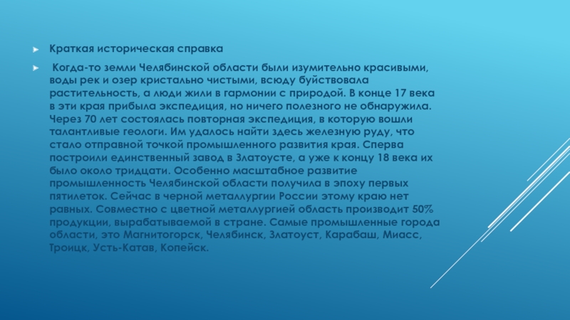 рек и озер кристально чистыми, всюду буйствовала растительность, а люди жили в гармонии с природой. В конце 17 века в эти края прибыла экспедиция, но ничего полезного не обнаружила. Через 70 лет состоялась повторная экспедиция, в которую вошли талантливые геологи. Им удалось найти здесь железную руду, что стало отправной точкой промышленного развития края. Сперва построили единственный завод в Златоусте, а уже к концу 18 века их было около тридцати. Особенно масштабное развитие промышленность Челябинской области получила в эпоху первых пятилеток. Сейчас в черной металлургии России этому краю нет равных. Совместно с цветной металлургией область производит 50% продукции, вырабатываемой в стране. Самые промышленные города области, это Магнитогорск, Челябинск, Златоуст, Карабаш, Миасс, Троицк, Усть-Катав, Копейск.