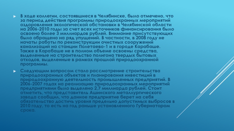 действия программы природоохранных мероприятий оздоровления экологической обстановки в Челябинской области на 2006-2010 годы за счет всех источников финансирования было освоено более 3 миллиардов рублей. Внимание присутствующих было обращено на ряд упущений. В частности, в 2008 году не начаты работы по реконструкции очистных сооружений канализаций на станции Полетаево-1 и в городе Карабаше. Также в Карабаше не в полном объеме освоены средства, выделенные на строительство полигона твердых бытовых отходов, выделенные в рамках прошлой природоохранной программы.
