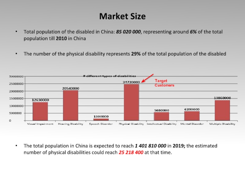 The total population in China is expected to reach 1 401 810 000 in 2019; the estimated number of physical disabilities could reach 25 218 400 at that time.
