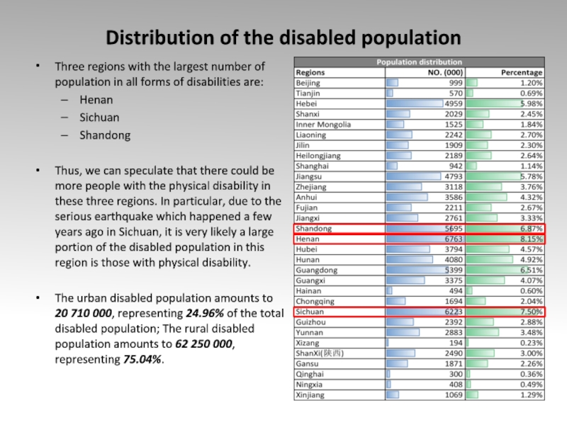 Thus, we can speculate that there could be more people with the physical disability in these three regions. In particular, due to the serious earthquake which happened a few years ago in Sichuan, it is very likely a large portion of the disabled population in this region is those with physical disability.