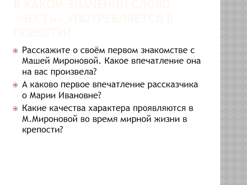 Слайд 4В КАКОМ ЗНАЧЕНИИ СЛОВО «ЧЕСТЬ» УПОТРЕБЛЯЕТСЯ В ПОВЕСТИ?