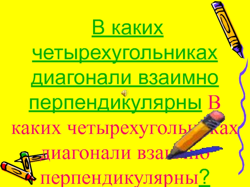 Слайд 17 В каких четырехугольниках диагонали взаимно перпендикулярны В каких четырехугольниках диагонали