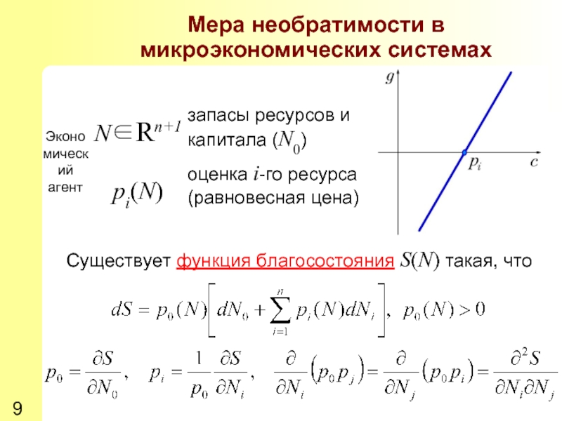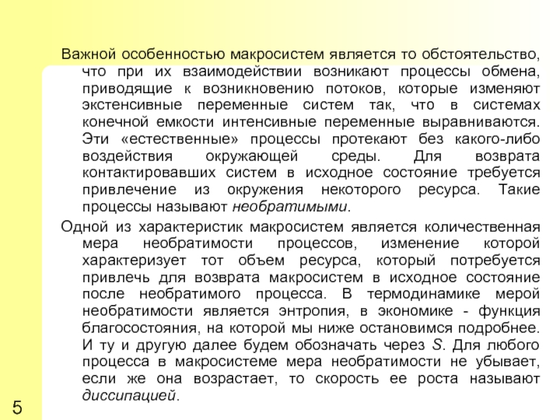 Одной из характеристик макросистем является количественная мера необратимости процессов, изменение которой характеризует тот объем ресурса, который потребуется привлечь для возврата макросистем в исходное состояние после необратимого процесса. В термодинамике мерой необратимости является энтропия, в экономике - функция благосостояния, на которой мы ниже остановимся подробнее. И ту и другую далее будем обозначать через S. Для любого процесса в макросистеме мера необратимости не убывает, если же она возрастает, то скорость ее роста называют диссипацией.