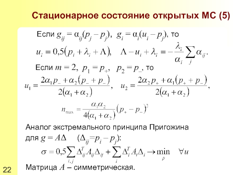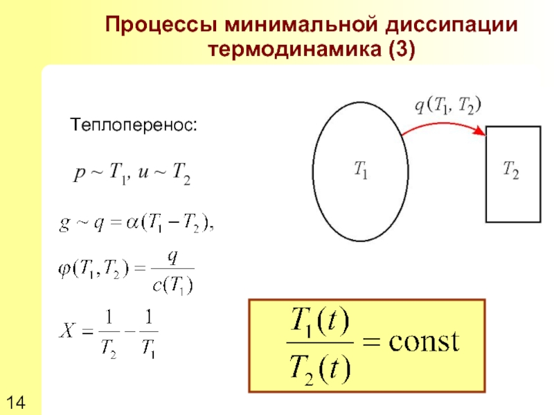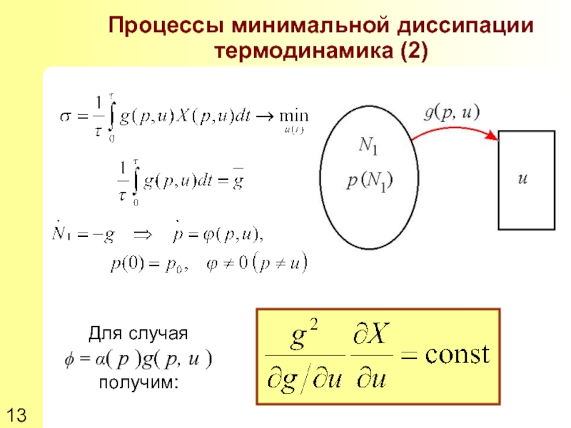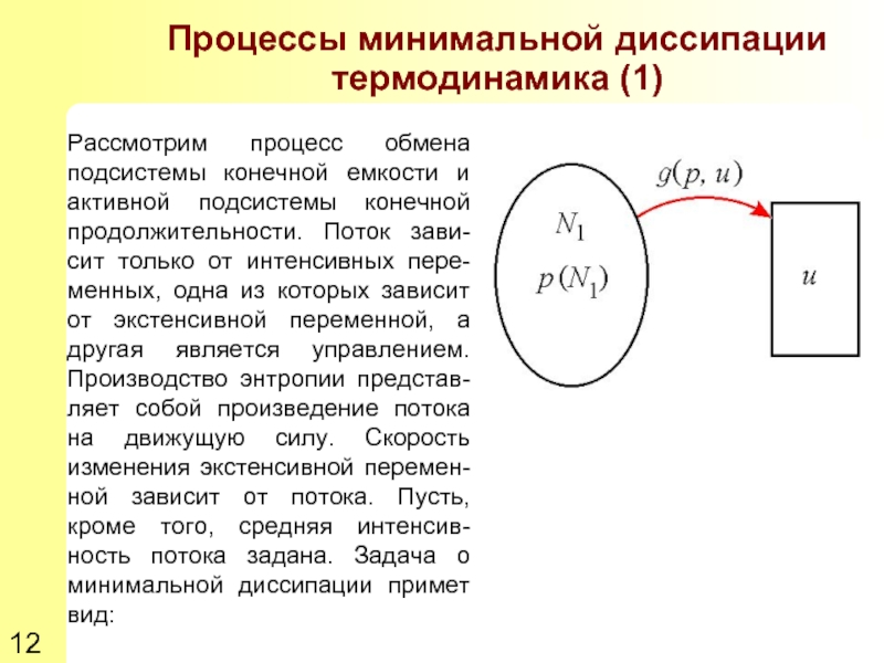подсистемы конечной продолжительности. Поток зави-сит только от интенсивных пере-менных, одна из которых зависит от экстенсивной переменной, а другая является управлением. Производство энтропии представ-ляет собой произведение потока на движущую силу. Скорость изменения экстенсивной перемен-ной зависит от потока. Пусть, кроме того, средняя интенсив-ность потока задана. Задача о минимальной диссипации примет вид: