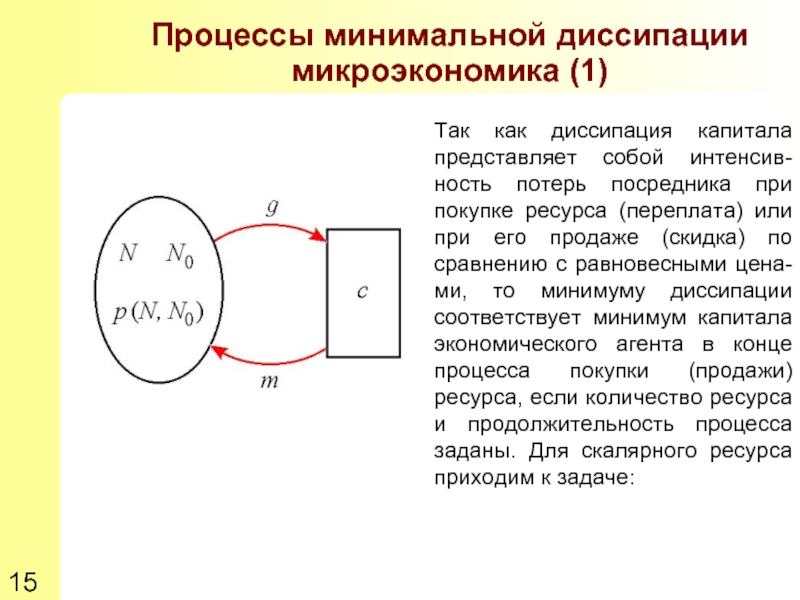 посредника при покупке ресурса (переплата) или при его продаже (скидка) по сравнению с равновесными цена-ми, то минимуму диссипации соответствует минимум капитала экономического агента в конце процесса покупки (продажи) ресурса, если количество ресурса и продолжительность процесса заданы. Для скалярного ресурса приходим к задаче: