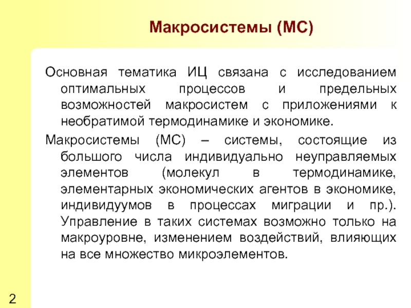 Макросистемы (МС) – системы, состоящие из большого числа индивидуально неуправляемых элементов (молекул в термодинамике, элементарных экономических агентов в экономике, индивидуумов в процессах миграции и пр.). Управление в таких системах возможно только на макроуровне, изменением воздействий, влияющих на все множество микроэлементов.