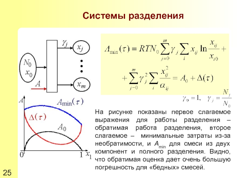 обратимая работа разделения, второе слагаемое – минимальные затраты из-за необратимости, и Amin для смеси из двух компонент и полного разделения. Видно, что обратимая оценка дает очень большую погрешность для «бедных» смесей.