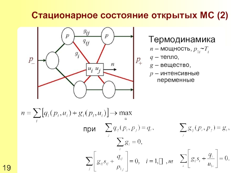 В стационарном режиме потоки отличны от нуля, если число резервуаров больше двух и их интенсивные переменные различны. Для простоты рассмотрим систему с двумя резервуарами. Активная система может контактировать как с резервуарами, так и с любой из подсистем, устанавливая в точках контакта значения интенсивных переменных. Требуется выбрать такие значения переменных u, чтобы извлекаемый ею поток «организованной» энергии (работы, работы разделения, электрической энергии) был максимален.