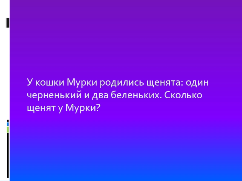 У кошки Мурки родились щенята: один черненький и два беленьких. Сколько