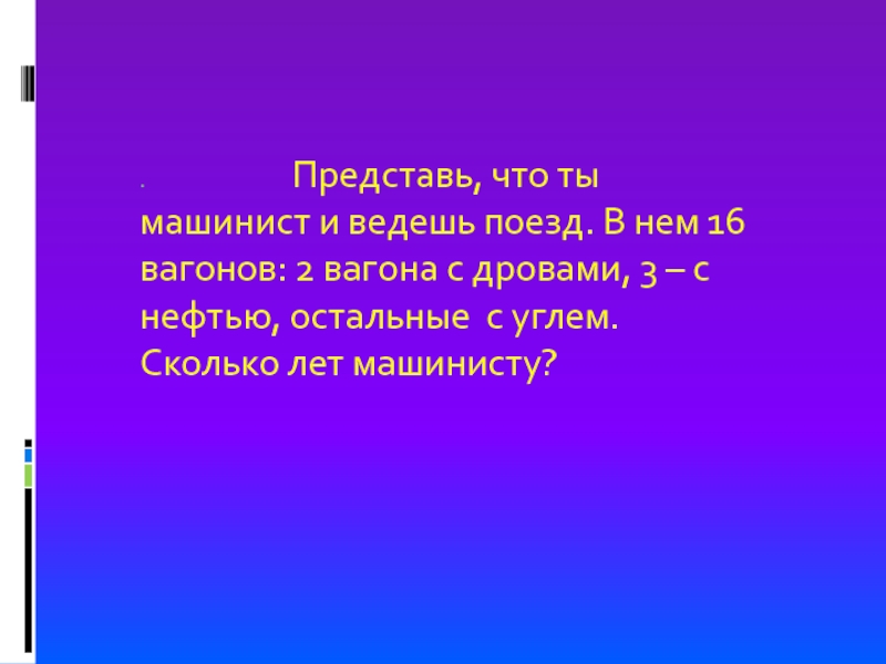 вагонов: 2 вагона с дровами, 3 – с нефтью, остальные с углем. Сколько лет машинисту?