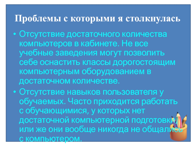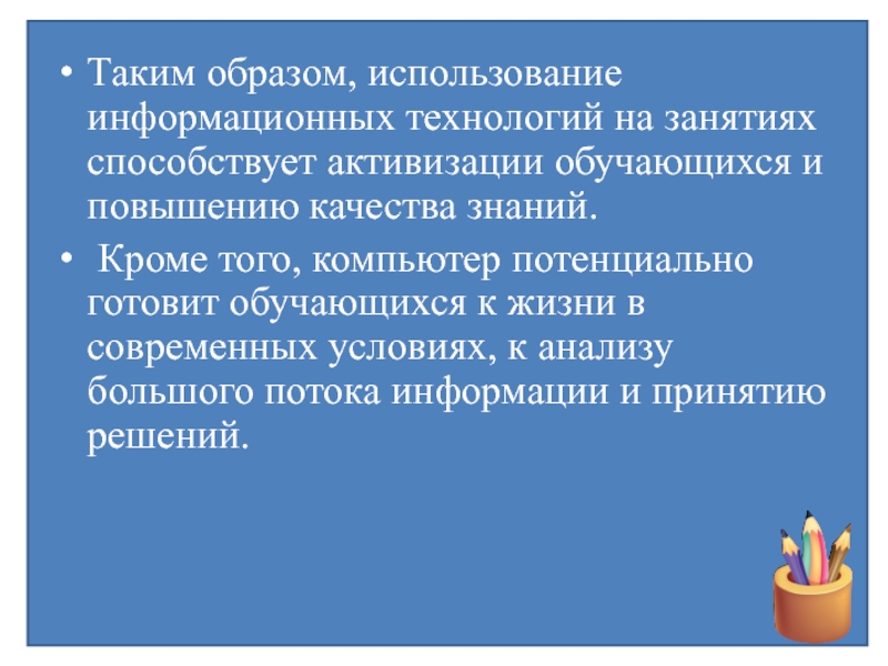 Эффективное использование компьютера на уроке, умелое сочетание своего педагогического мастерства и возможностей компьютерной техники позволяет преподавателю повышать качество знаний обучающихся.
