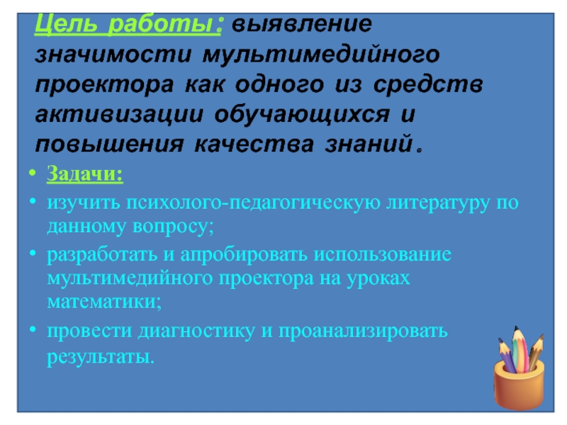 разработать и апробировать использование мультимедийного проектора на уроках математики;