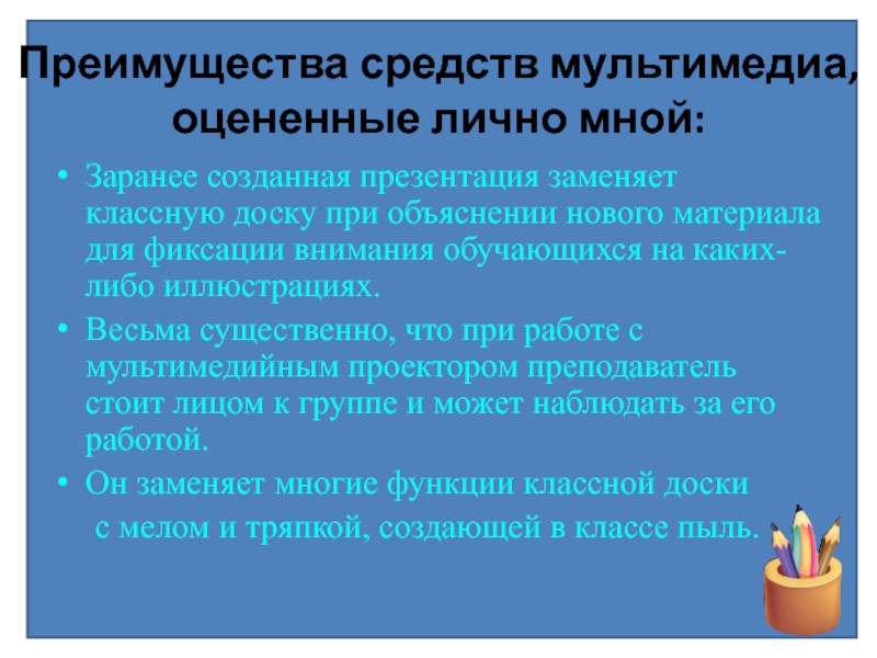 Использование мультимедийных средств позволяет повысить эффективность учебного процесса и качества обучения, помогают преподавателю привнести эффект дополнительной наглядности в занятия, что способствует привлечению внимания и усвоению обучающимися материала быстрее и в большем объеме.