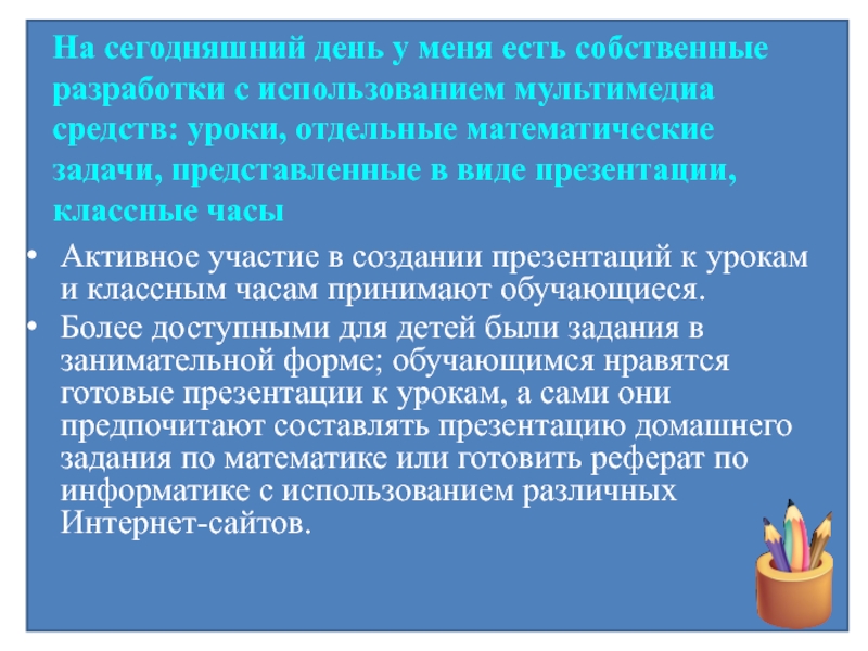 Более доступными для детей были задания в занимательной форме; обучающимся нравятся готовые презентации к урокам, а сами они предпочитают составлять презентацию домашнего задания по математике или готовить реферат по информатике с использованием различных Интернет-сайтов.