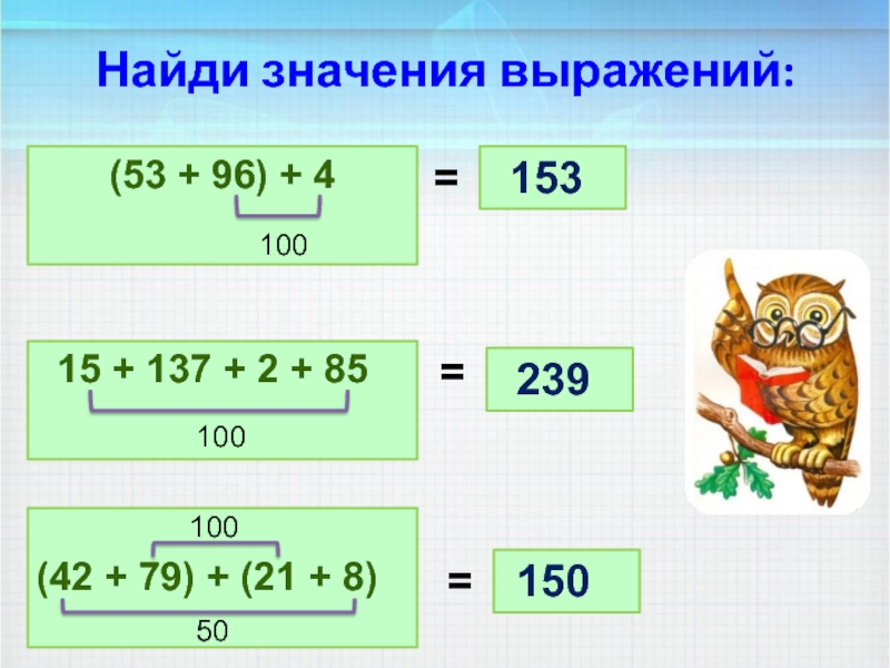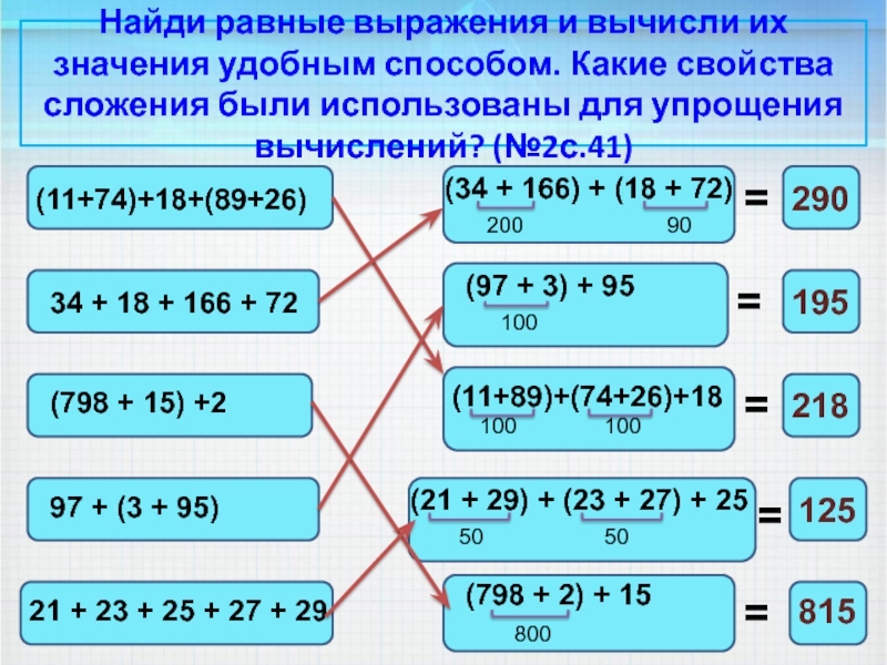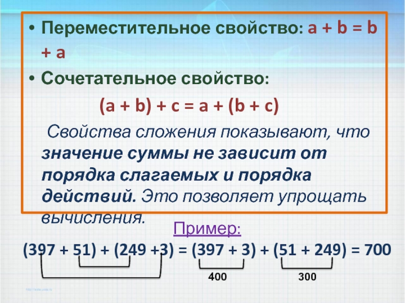 Свойства сложения показывают, что значение суммы не зависит от порядка слагаемых и порядка действий. Это позволяет упрощать вычисления.