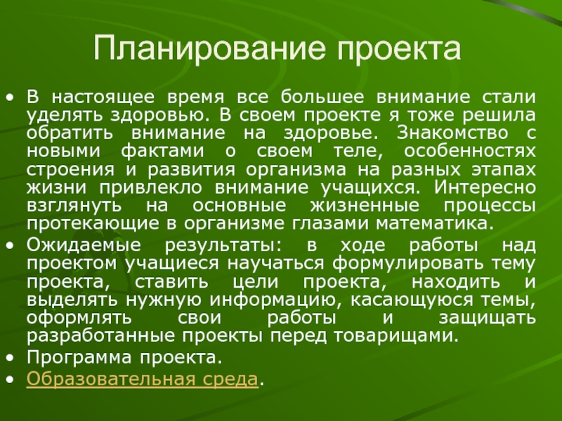 своем проекте я тоже решила обратить внимание на здоровье. Знакомство с новыми фактами о своем теле, особенностях строения и развития организма на разных этапах жизни привлекло внимание учащихся. Интересно взглянуть на основные жизненные процессы протекающие в организме глазами математика.