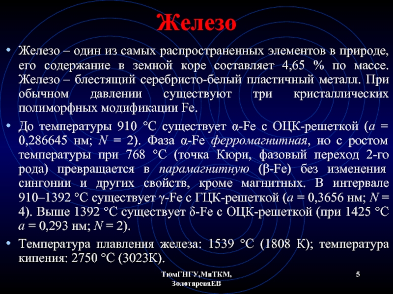 земной коре составляет 4,65 % по массе. Железо – блестящий серебристо-белый пластичный металл. При обычном давлении существуют три кристаллических полиморфных модификации Fe.