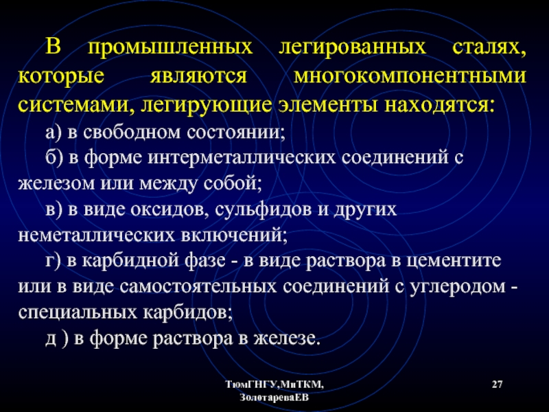 В промышленных легированных сталях, которые являются многокомпонентными системами, легирующие элементы находятся: