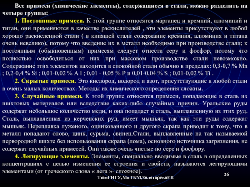 Все примеси (химические элементы), содержащиеся в стали, можно разделить на четыре
