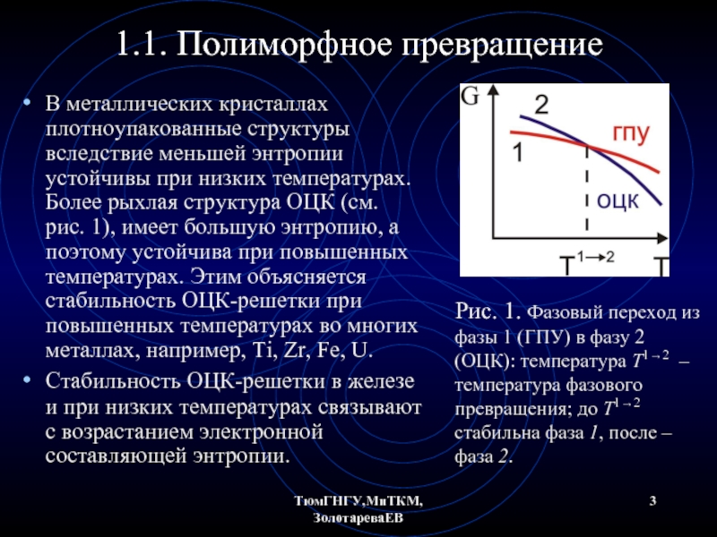при низких температурах. Более рыхлая структура ОЦК (см. рис. 1), имеет большую энтропию, а поэтому устойчива при повышенных температурах. Этим объясняется стабильность ОЦК-решетки при повышенных температурах во многих металлах, например, Ti, Zr, Fe, U.