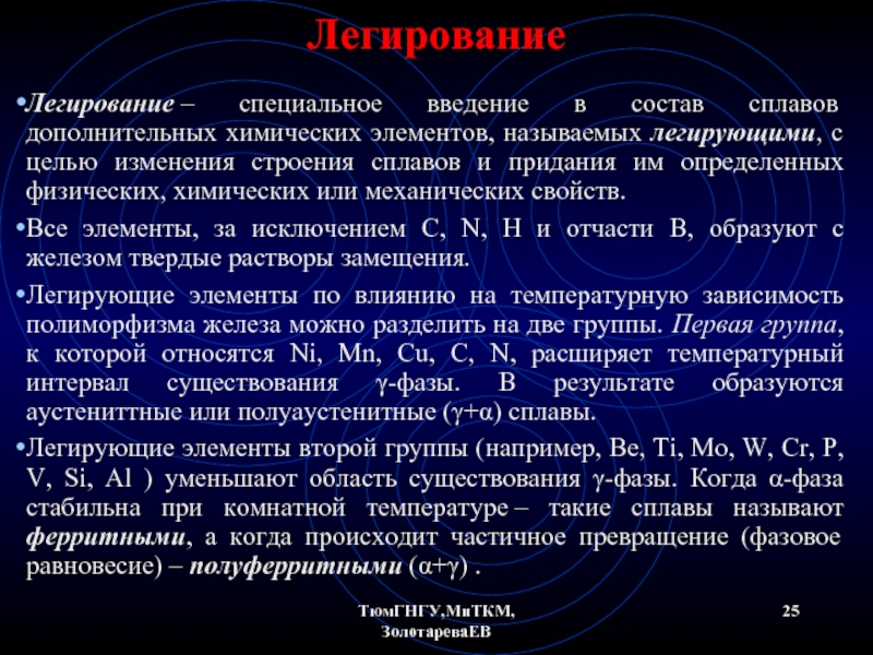 Легирующие элементы по влиянию на температурную зависимость полиморфизма железа можно разделить на две группы. Первая группа, к которой относятся Ni, Mn, Cu, C, N, расширяет температурный интервал существования γ-фазы. В результате образуются аустениттные или полуаустенитные (γ+α) сплавы.
