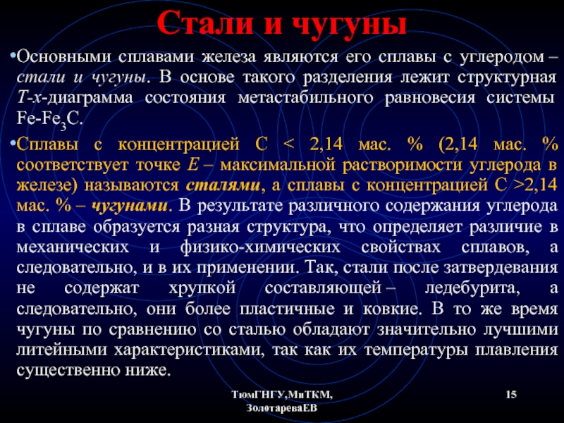 Сплавы с концентрацией С < 2,14 мас. % (2,14 мас. % соответствует точке Е – максимальной растворимости углерода в железе) называются сталями, а сплавы с концентрацией С >2,14 мас. % – чугунами. В результате различного содержания углерода в сплаве образуется разная структура, что определяет различие в механических и физико-химических свойствах сплавов, а следовательно, и в их применении. Так, стали после затвердевания не содержат хрупкой составляющей – ледебурита, а следовательно, они более пластичные и ковкие. В то же время чугуны по сравнению со сталью обладают значительно лучшими литейными характеристиками, так как их температуры плавления существенно ниже.