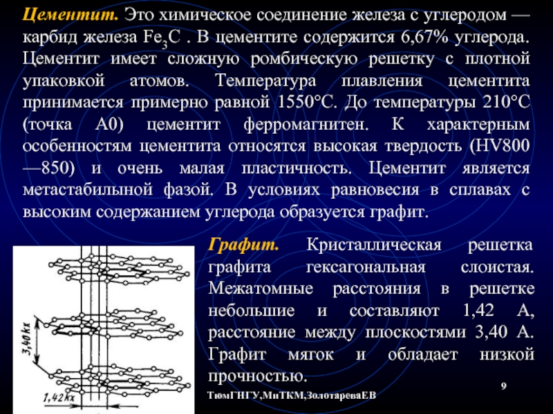 . В цементите содержится 6,67% углерода. Цементит имеет сложную ромбическую решетку с плотной упаковкой атомов. Температура плавления цементита принимается примерно равной 1550°С. До температуры 210°С (точка А0) цементит ферромагнитен. К характерным особенностям цементита относятся высокая твердость (HV800 —850) и очень малая пластичность. Цементит является метастабилыной фазой. В условиях равновесия в сплавах с высоким содержанием углерода образуется графит.