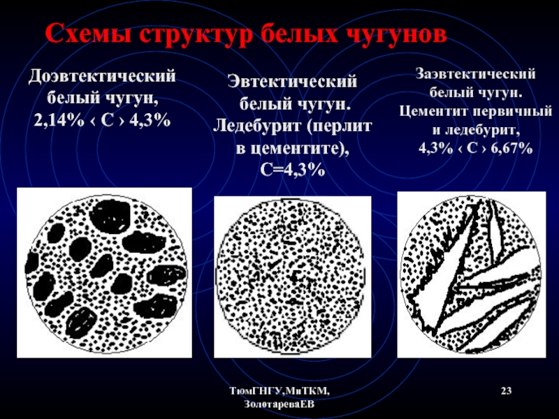 состава 4,3 % С. Доэвтектические чугуны имеют перлитно-ледебуритную структуру, а заэвтектические – цементитно-ледебуритную.