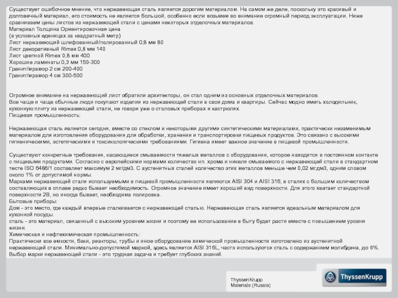 Слайд 24Существует ошибочное мнение, что нержавеющая сталь является дорогим материалом. На самом