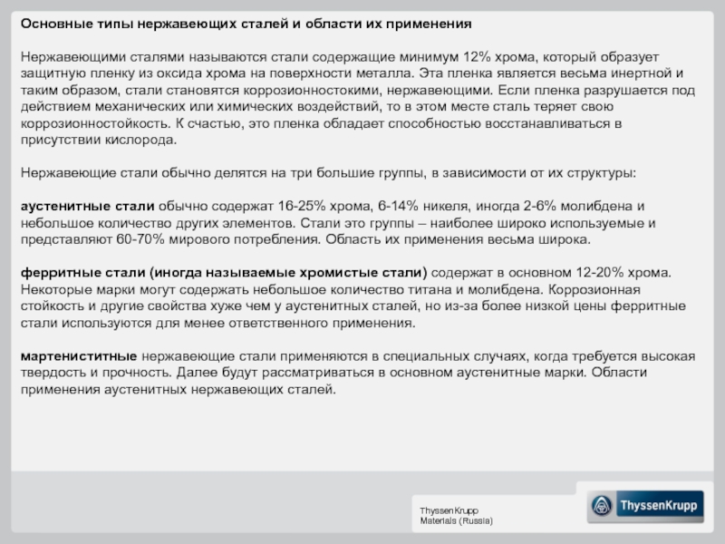 содержащие минимум 12% хрома, который образует защитную пленку из оксида хрома на поверхности металла. Эта пленка является весьма инертной и таким образом, стали становятся коррозионностокими, нержавеющими. Если пленка разрушается под действием механических или химических воздействий, то в этом месте сталь теряет свою коррозионностойкость. К счастью, это пленка обладает способностью восстанавливаться в присутствии кислорода.