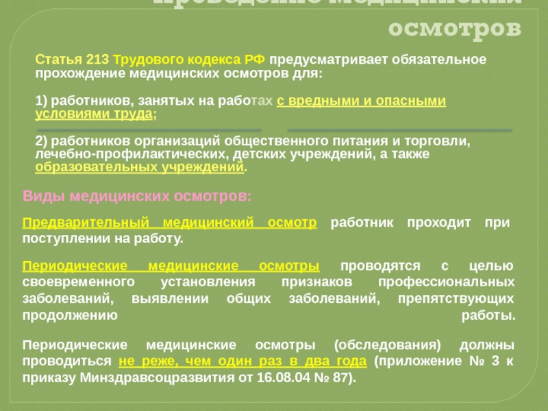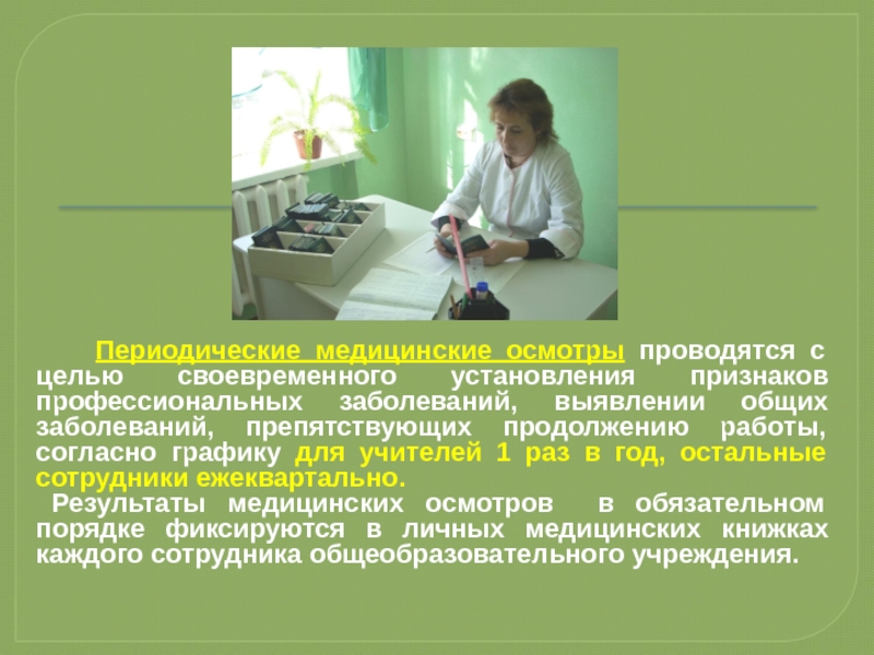 Слайд 27 Периодические медицинские осмотры проводятся с целью своевременного установления признаков профессиональных заболеваний,