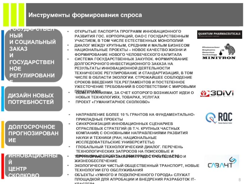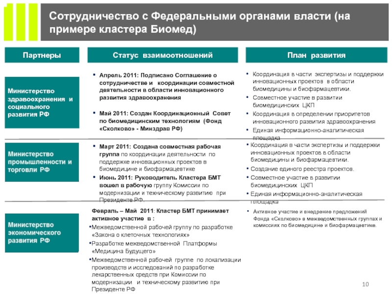 Активное участие и внедрение предложений Фонда «Сколково» в межведомственных группах и комиссиях по биомедицине и биофармацевтике.